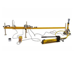 3.安置承載板及千斤頂 將承載板放置于測(cè)試點(diǎn)上,使承載板與地面完全接觸,必要時(shí)可鋪設(shè)一薄層干燥砂(2~3mm)或石膏膩?zhàn)?,同時(shí)利用承載板上水準(zhǔn)泡或水準(zhǔn)儀來(lái)調(diào)整承載板水平。 將反力裝置承載部位安置于承載板上方,并加以制動(dòng)。承載板外側(cè)邊緣與反力裝置支撐點(diǎn)之間的距離不得小于0.75m。將千斤頂放在承載板的中心位置,使千斤頂保持垂直。用加長(zhǎng)桿和調(diào)節(jié)絲桿使千斤頂頂端球鉸座與反力裝置承載部位緊貼。